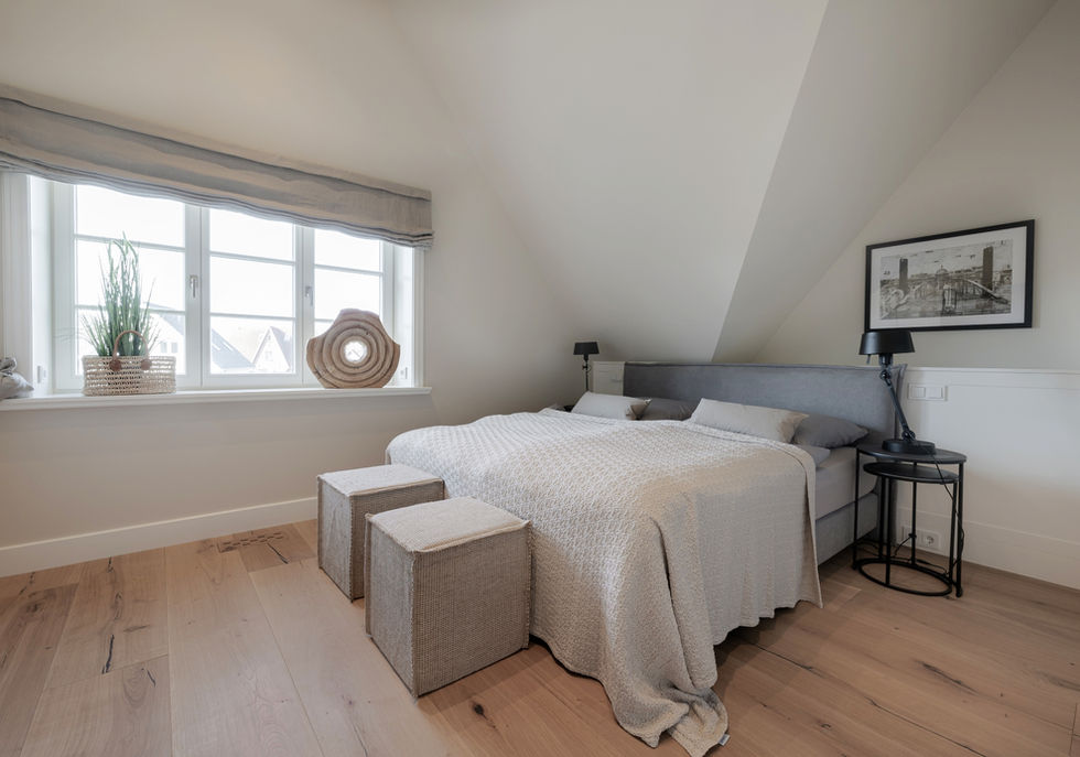 Im Dachgeschoss erwarten Sie zwei Schlafzimmer mit Maßanfertigungen, ein Bad mit Regendusche und Doppelwaschbecken sowie eine begehbare Ankleide.