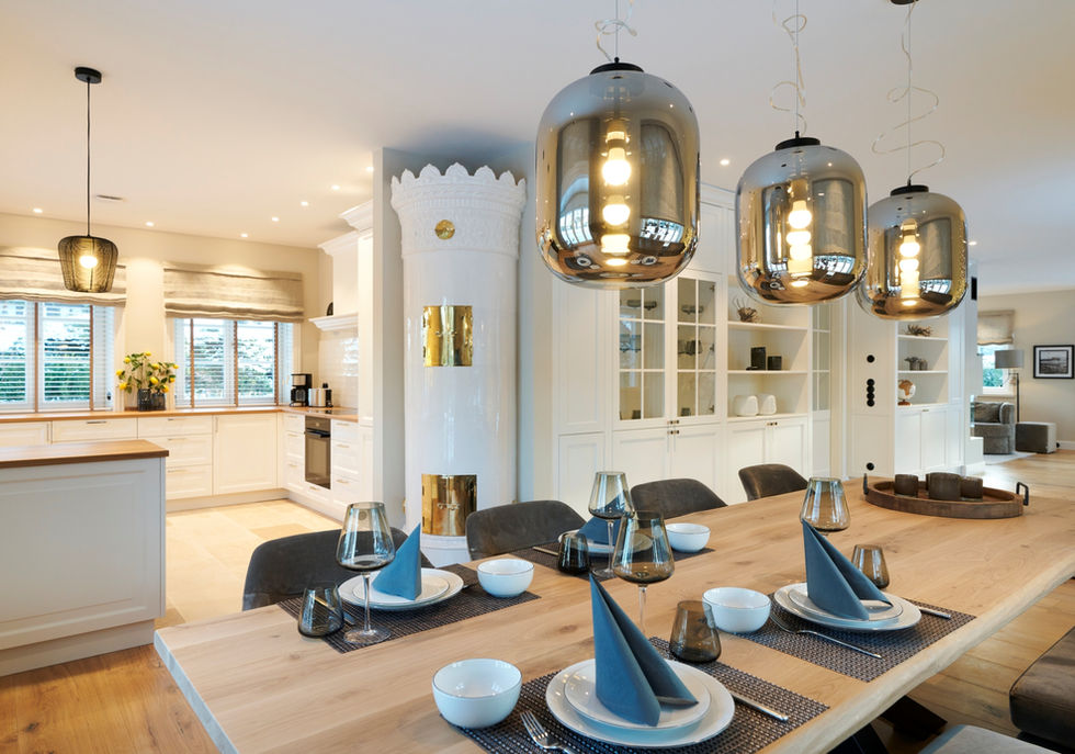 Herzstück ist das repräsentative Entrée mit Homelift über drei Etagen. Im Erdgeschoss befindet sich der offene Wohn- und Essbereich mit Designküche, Kachelofen und Gaskamin.